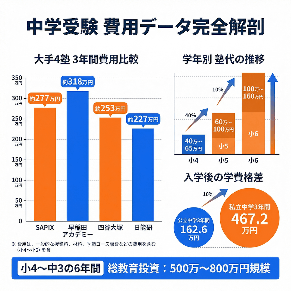 中学受験の塾代(3年間で200万〜320万円)と合わせると、小4から中学卒業までの6年間で500万〜800万円規模の教育投資が必要になる計算です。